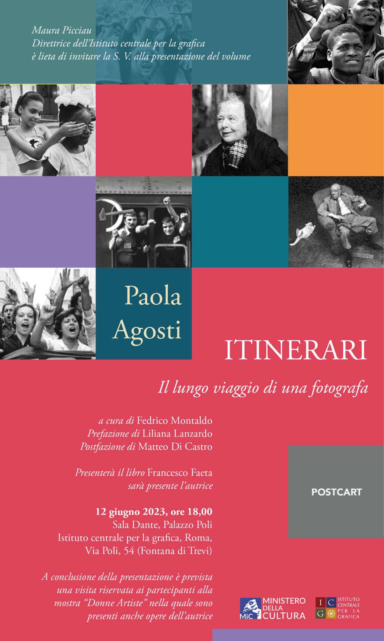 Lunedì 12 giugno 2023 alle ore 18.00 presso l’Istituto centrale per la grafica si terrà la presentazione del libro fotografico di Paola Agosti ITINERARI – Il lungo viaggio di una fotografa a cura di Federico Montaldo, con una prefazione di Liliana Lanzardo e una postfazione di Matteo Di Castro, edito da POSTCART Edizioni.